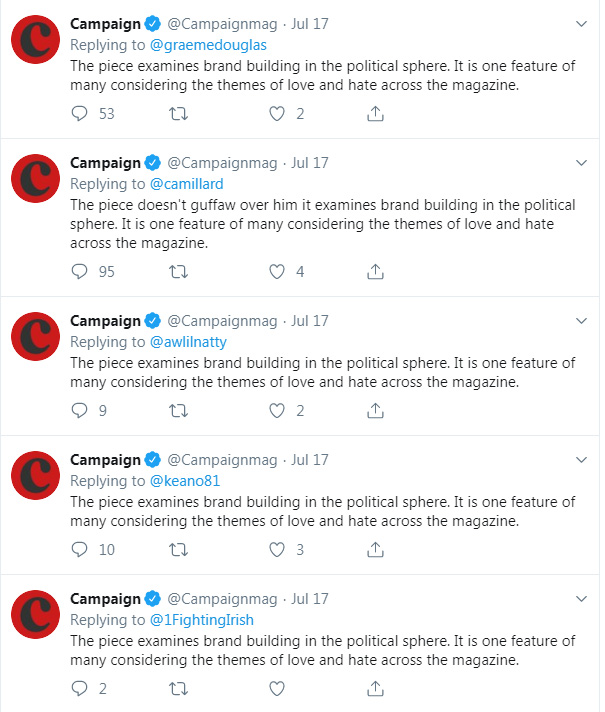 Unsurprisingly, the interview – a bonhomous exchange, which took place at Global Media & Entertainment’s headquarters shortly before Farage’s LBC radio show – received a torrent of negative reaction. So much so, that when the magazine’s holding pattern failed – which saw its social media account farting identical, pre-prepared tweets off into the ether – Campaign editor Claire Beale had to write a response addressing the social media backlash, where she affirmed that her magazine “does not tolerate racism, sexism or bigotry of any kind”. It said a lot about her choice of cover star that she had to denounce everything Farage stands for.