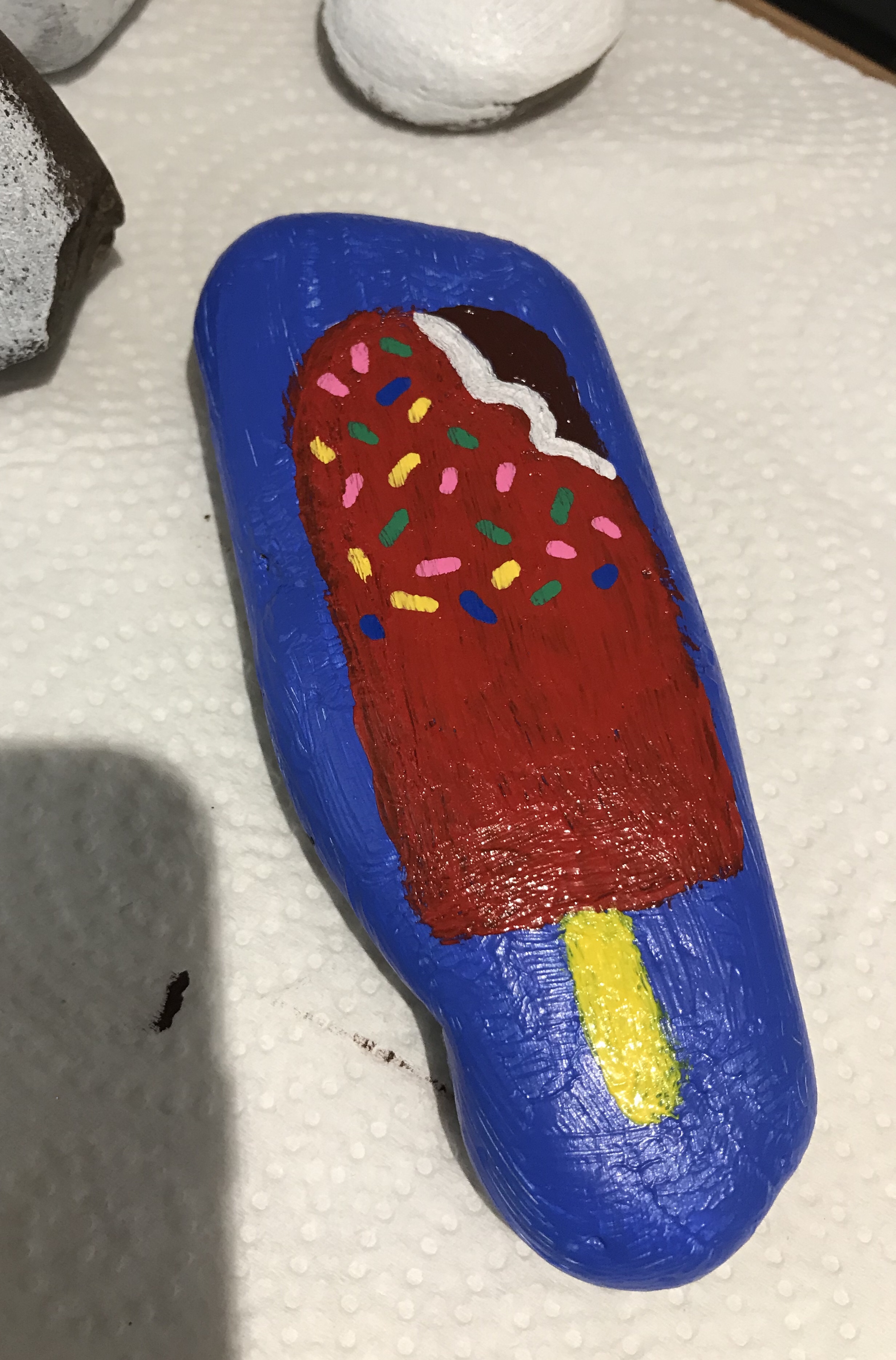 For my first attempt, I painted a Fab lolly and hid the rock among some plants next to a pathway at work. However, when I went to check on it the following day after a night of torrential rain, it looked like it had been there for a hundred years. Due to my not sealing the rock properly the paint had bubbled and blistered, like a terrible pox had befallen it. My lolly remained in the undergrowth for so many weeks, I felt like sneaking back and painting some ants crawling all over it – just to make it more authentic. It’s disappeared now, but I don’t know where to?