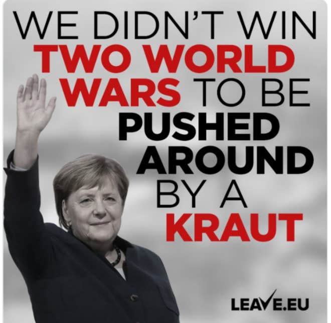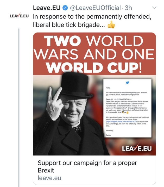 But for me, the nadir of the last three and a half years (in a crowded field of nadirs) was when Leave.EU tweeted a picture of German Chancellor Angela Merkel, with the words: “We didn’t win two world wars to be pushed around by a Kraut.” After causing widespread offence with that image, they then doubled down on their xenophobia by tweeting a picture of Winston Churchill sticking two fingers up, with the words: “Two World Wars and One World Cup!”.