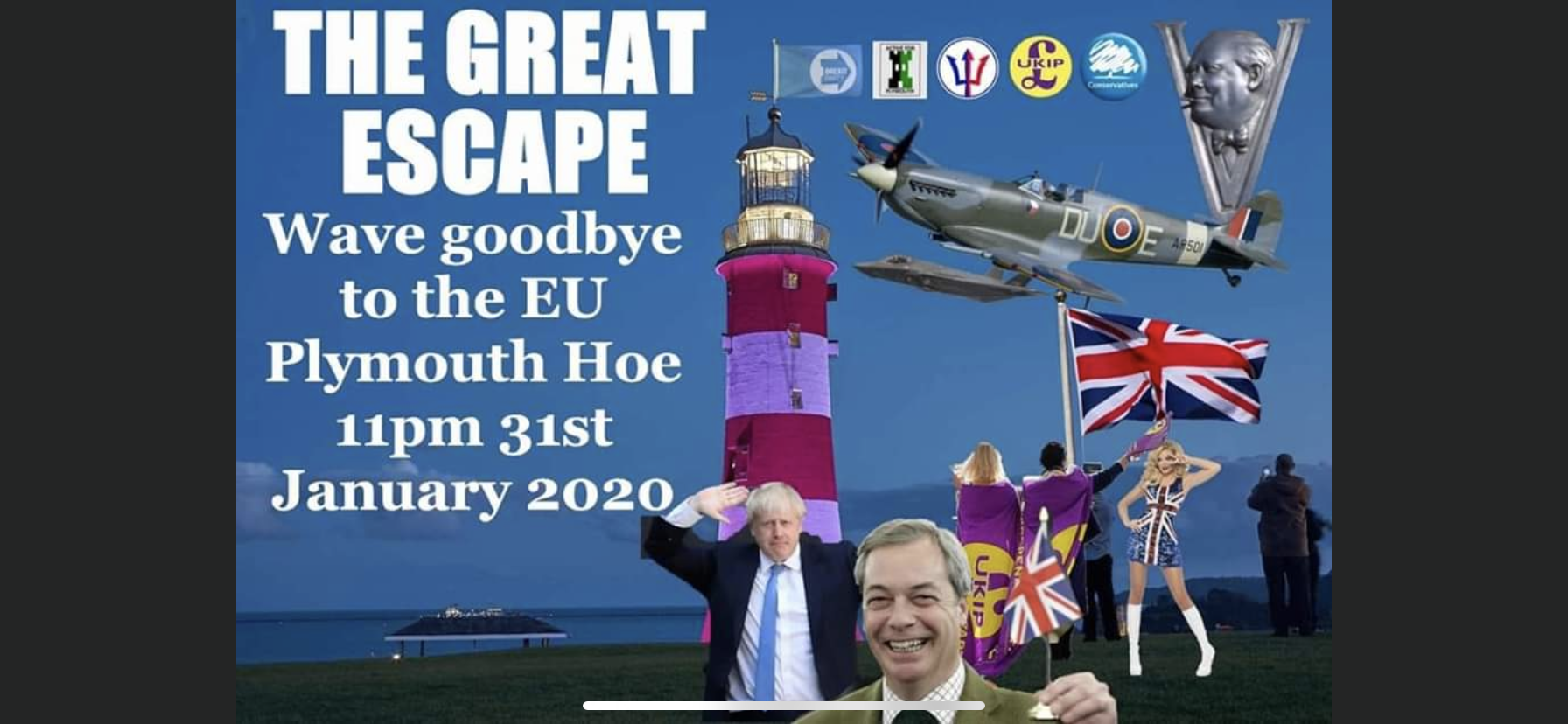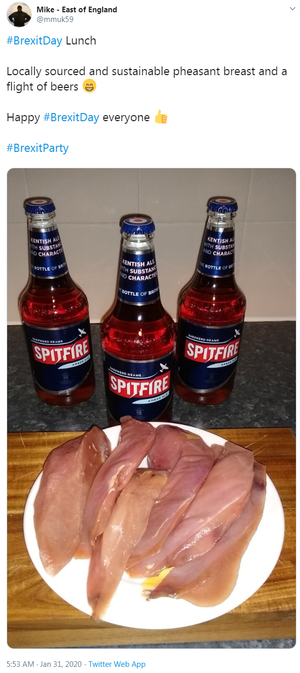 Leavers, in particular, seem obsessed with wartime nostalgia, which was on full cringeworthy display during ‘Brexit Day’. A leaflet for The Great Escape event at Plymouth Hoe prominently featured images of a Spitfire, a hood ornament of Winston Churchill’s head nestled in the crotch of a victory ‘V’, and also chief of the Special Operations Executive, Geri Halliwell, dressed in a Union flag dress. Meanwhile, patrons of the Rising Sun pub in Kettering joined hands for a rendition of Vera Lynn’s ‘We’ll Meet Again’ (back at the pub same time the following evening, presumably). One Brexit supporter even tweeted his #BrexitDay lunch, which appeared to consist of raw pheasant breast and three bottles of…wait for it: SPITFIRE! It certainly wasn’t a day for knocking back a few pints of Messerschmitt and demolishing a plate of schnitzel.